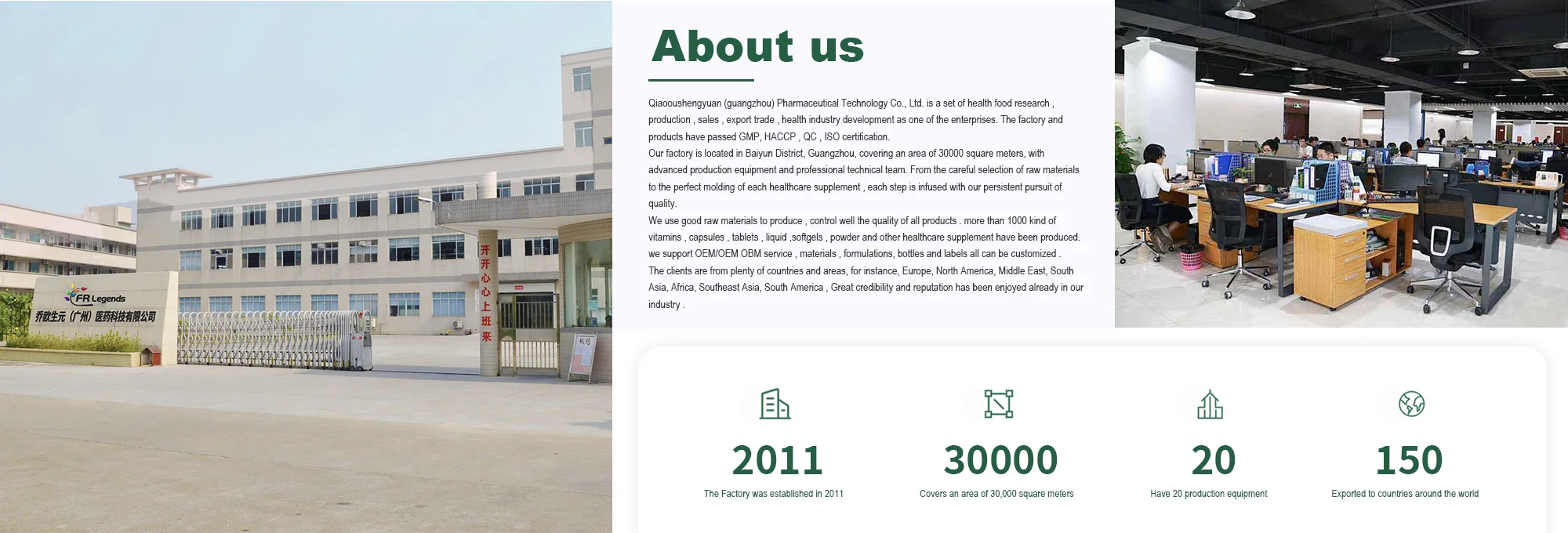 Qiaooushengyuan (guangzhou) Pharmaceutical Technology Co., Ltd. is a set of health food research, production, sales, export trade, health industry development as one of the enterprises. The factory and products have passed GMP, HCCP, QC, ISO certification. Our factory is located in Baiyun District, Guangzhou, covering an area of 30000 square meters, with advanced production equipment and professional technical team. From the careful selection of raw materials to the perfect molding of each healthcare supplement, each step is infused with our persistent pursuit of quality. We use good raw materials to produce, control well the quality of all products.